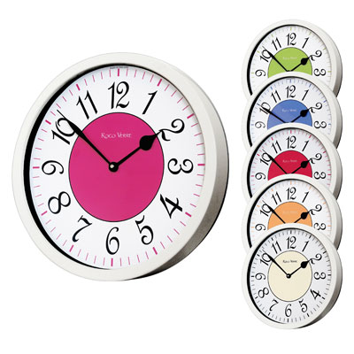 Around the outer edge of the dial are simple hour and minute markers to make the time immediately apparent. Central to the dial is a circle of block colour which can be cream, indigo, cerise, red, orange or lime green. A white metal case and glass front complete the elegant design to create a beautiful and elegant wall clock.