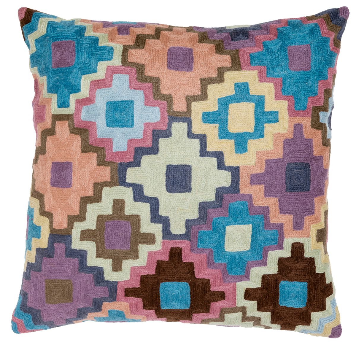 Each Zaida cushion has been hand made in Kashmir by master craftsmen using a century’s old chain stitch technique called crewel using high quality pre-dyed 100% wool yarn. The Kashmir wool thread makes them soft to the touch at the same time as durable and hard wearing.